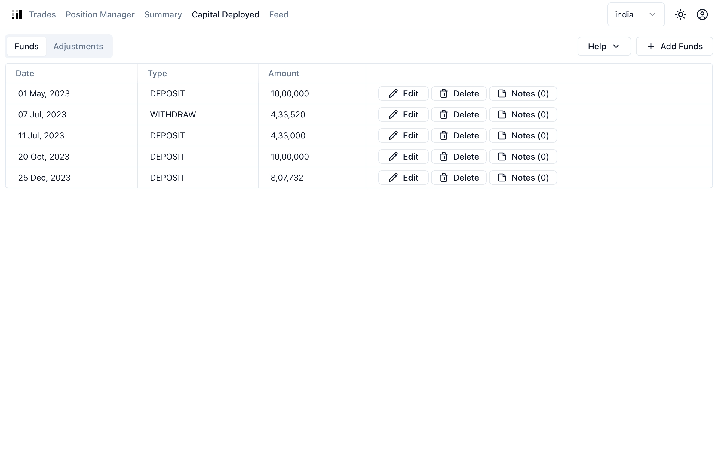 All your trades with relavant metrics. Sorting, filtering, export to excel all supported.